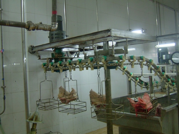 4、操作要點(diǎn):將浸燙好的豬頭插放在支撐座上,輸送鏈將豬頭牽引至刨毛機(jī)內(nèi),左右兩側(cè)旋轉(zhuǎn)軸上的橡膠條對豬頭進(jìn)行抽打摩擦,以實(shí)現(xiàn)脫毛。此時(shí)的豬頭在運(yùn)動中進(jìn)行旋轉(zhuǎn),能大面積去掉豬頭上的鬃毛。在刨毛過程中有水管噴淋將豬毛清洗干凈,刨毛結(jié)束后豬頭從機(jī)器上自動脫落。